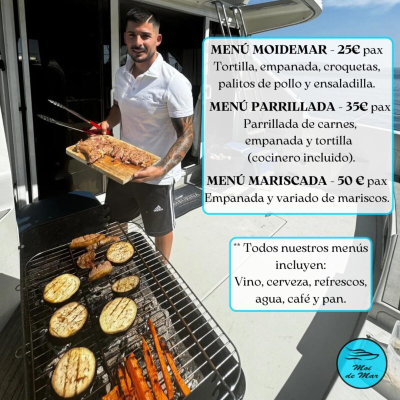 La oferta culinaria en el yate es un punto destacado de la travesía. Se ofrece un servicio de pensión completa, que incluye platos típicos que reflejan la rica gastronomía gallega.